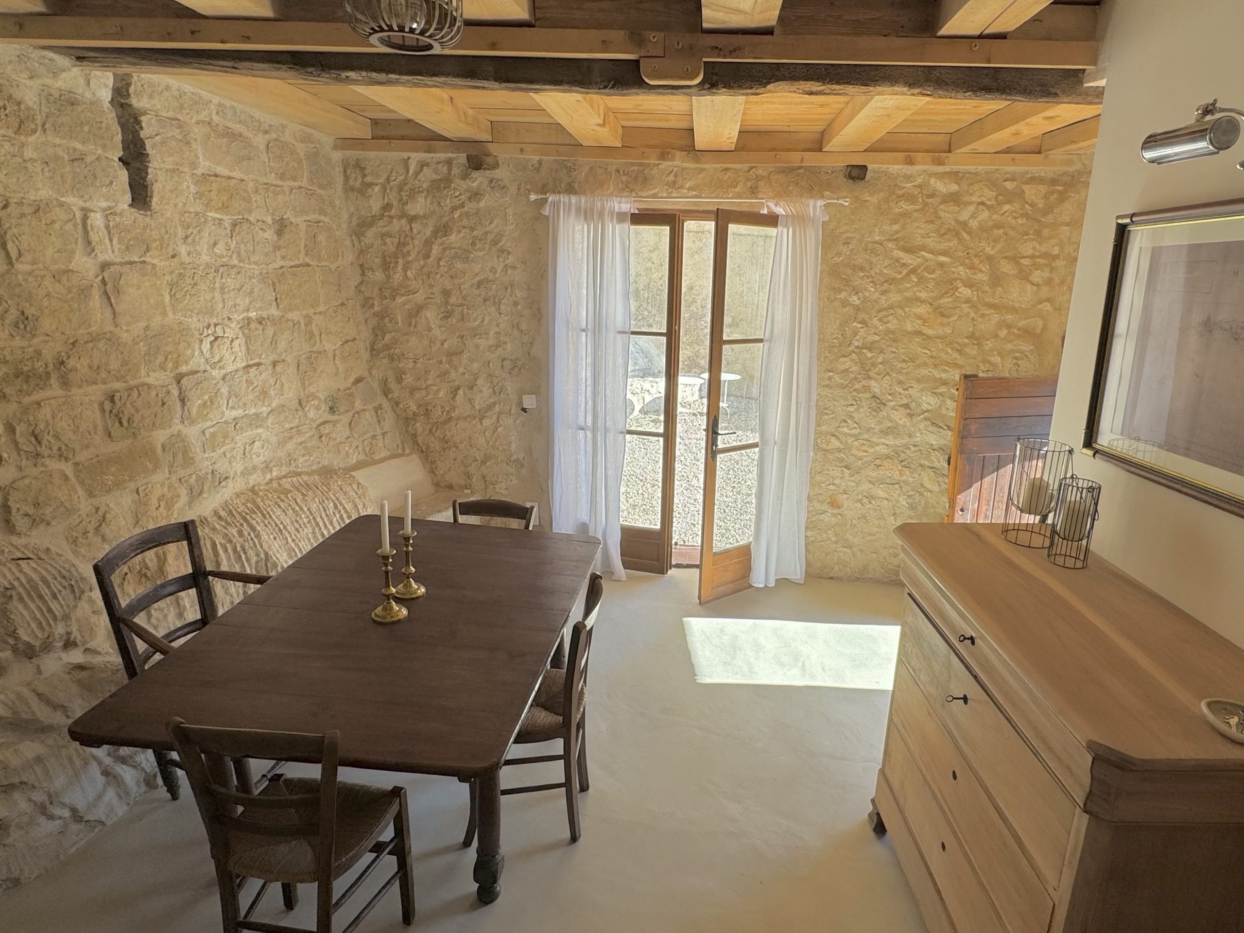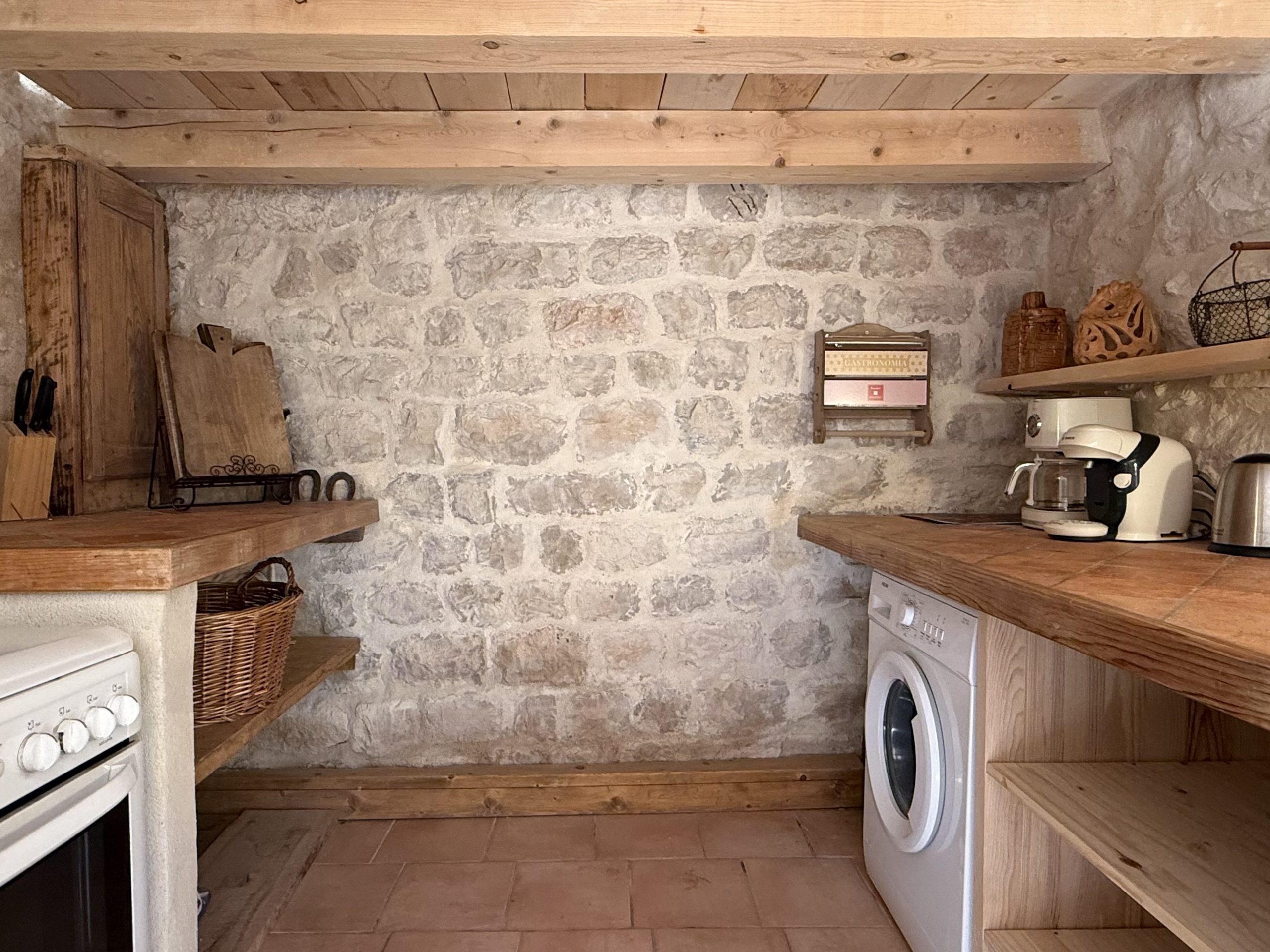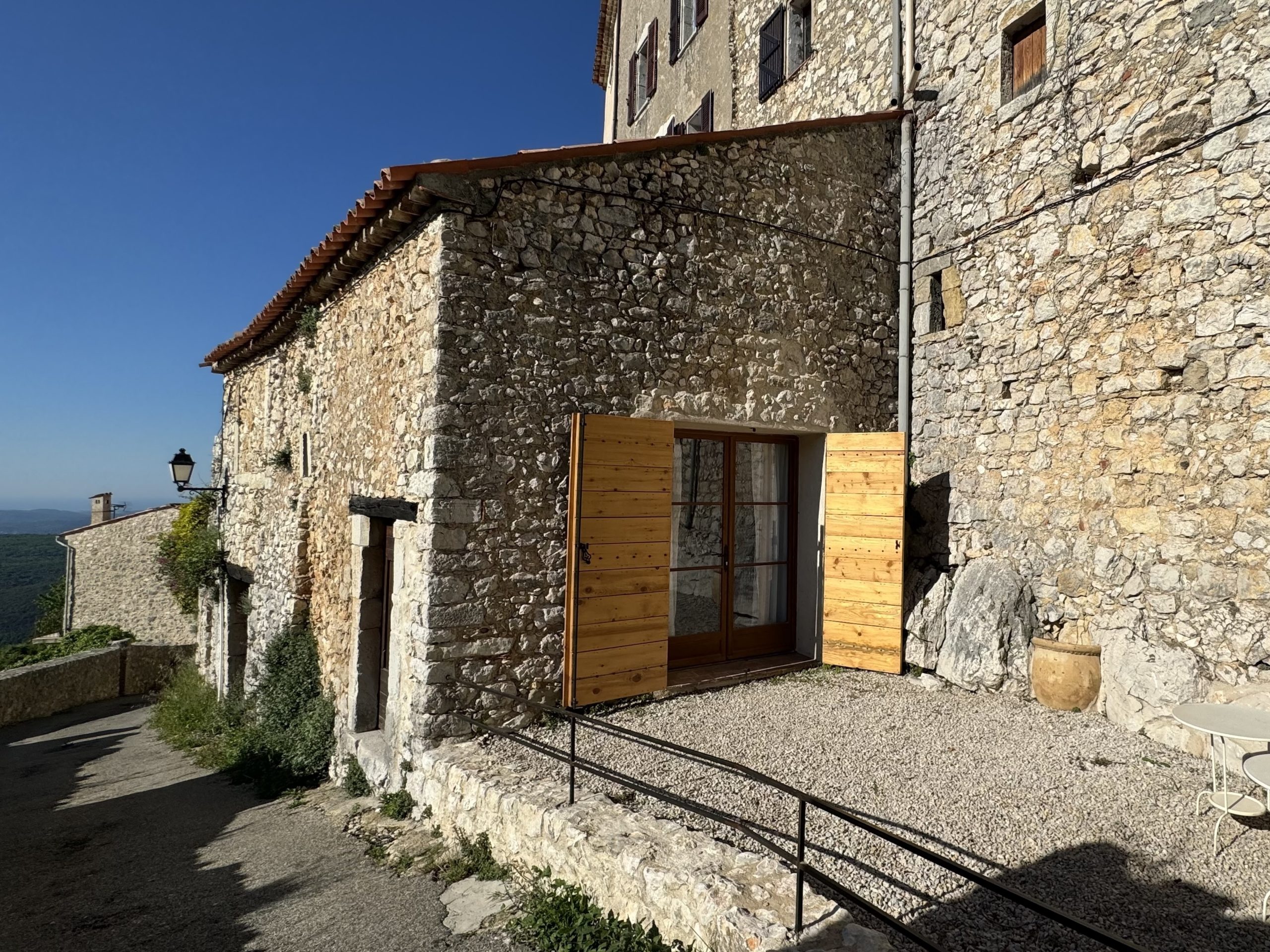 Rez-de-chaussée : séjour / salle à manger avec accès à une petite cour extérieure donnant sur la ruelle ; petite salle d’eau lumineuse avec douche ; cuisine équipée avec accès à la terrasse et au jardin panoramique, table extérieure et barbecue.
