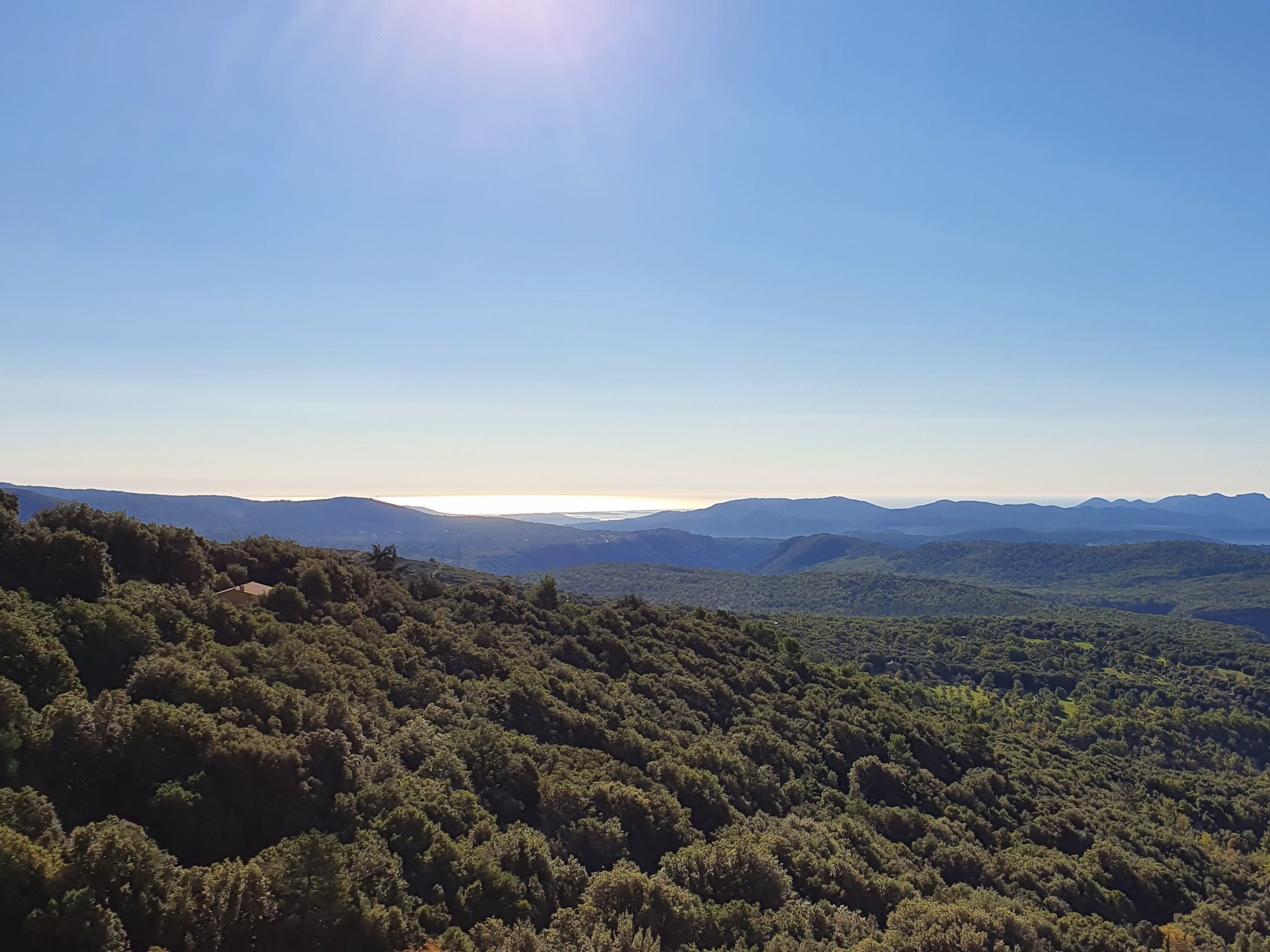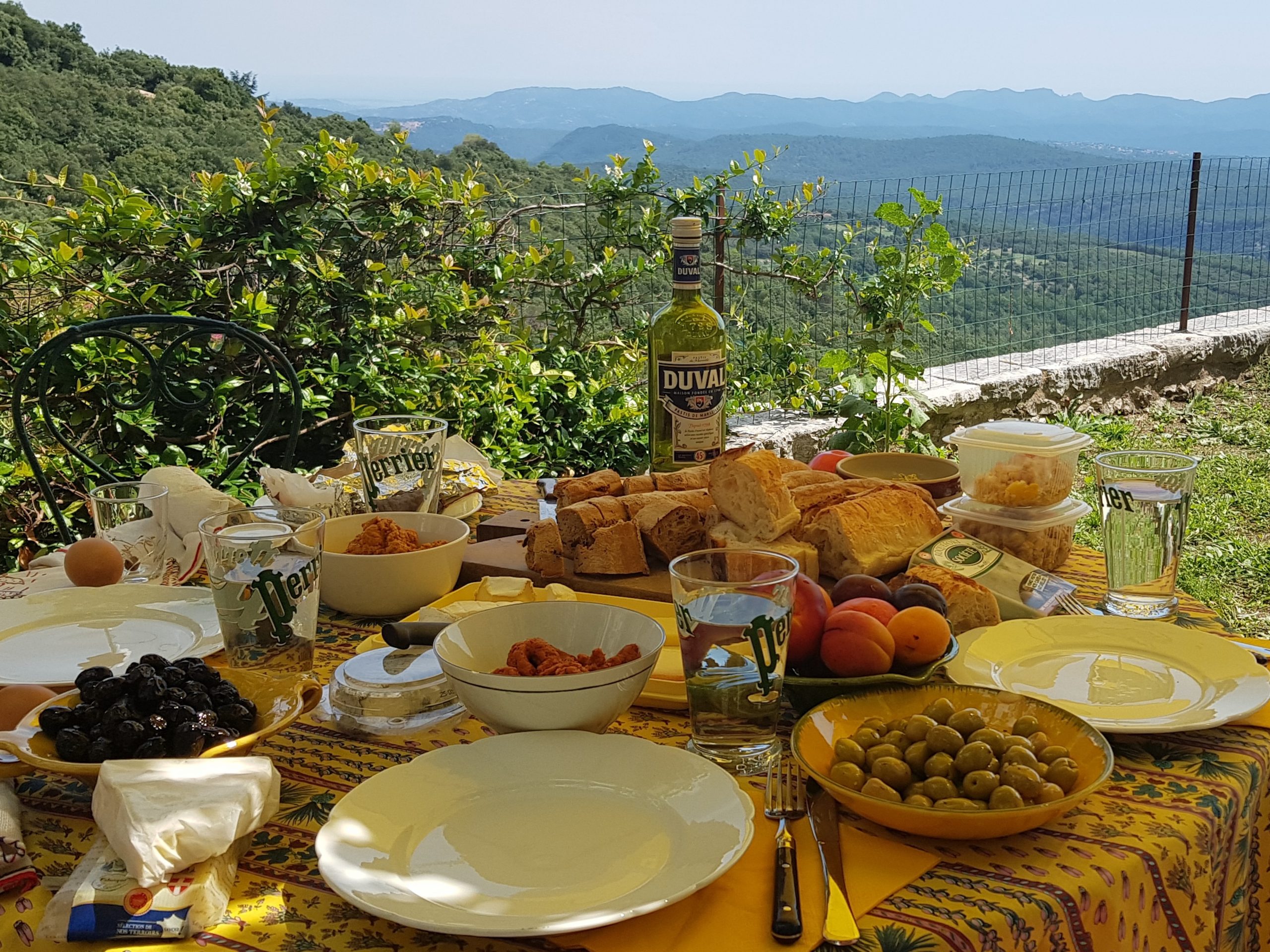 La terrasse, généreusement ombragée par la vigne et agrémentée d’une grande table extérieure, invite à savourer le petit-déjeuner tout en admirant la mer Méditerranée et le massif de l’Estérel.